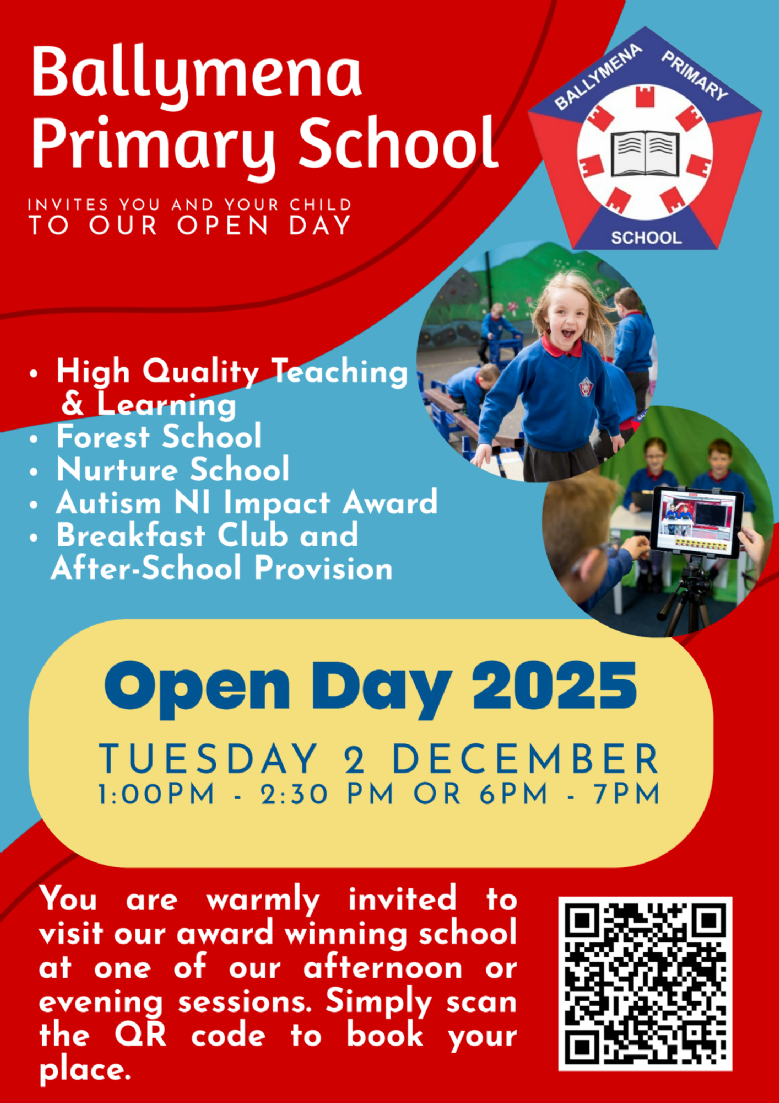 Welcome to our 'Open Day Page' for prospective Primary 1 pupils starting in September 2026. Thank you for taking the time to visit our page to find out more about our award winning, warm and welcoming school. Here you will find all of the information you need to learn why Ballymena Primary is the perfect choice of school for your child to flourish and develop. We hope that the information below will help to give a flavour of life at Ballymena Primary.